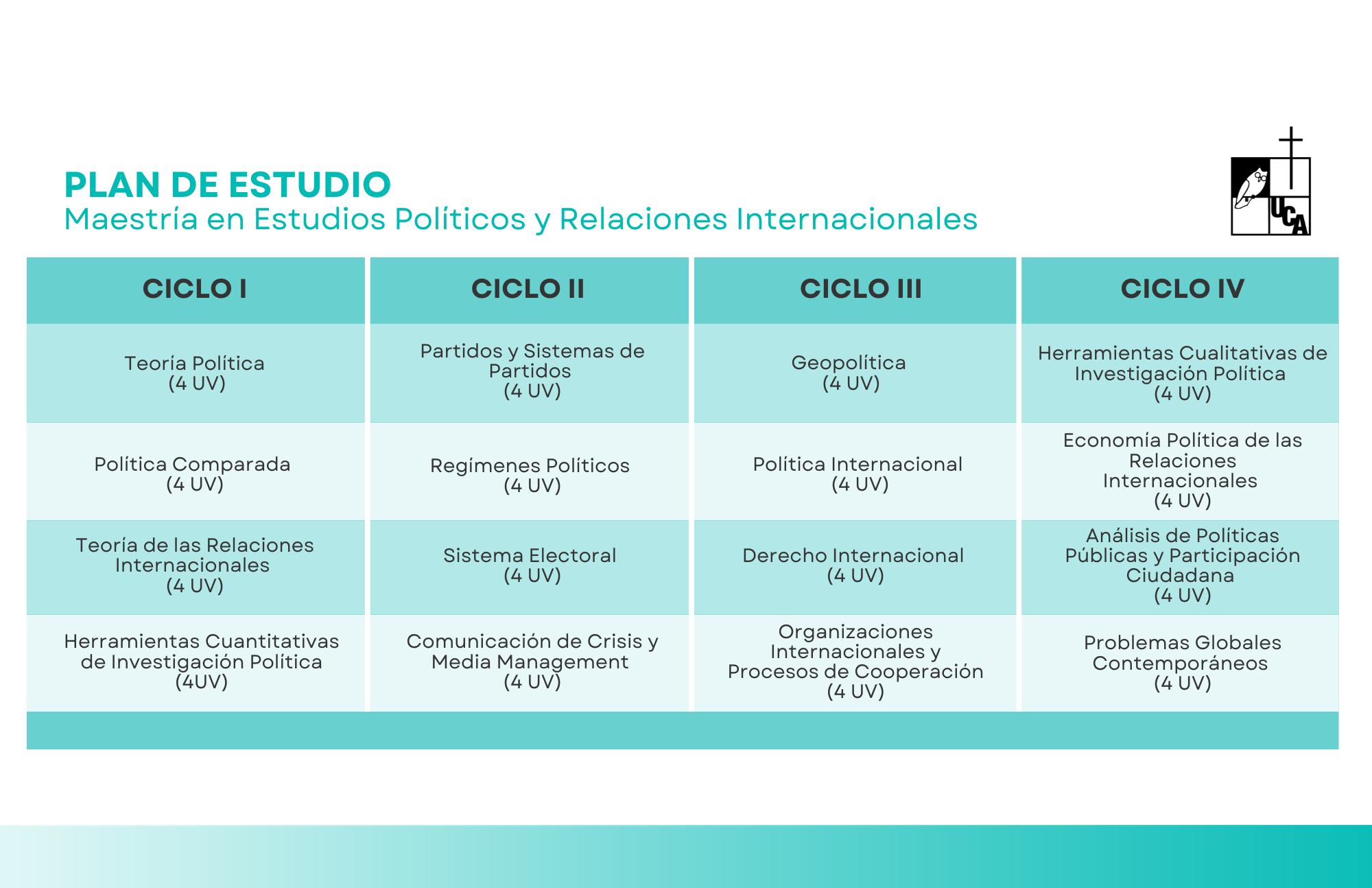 - Horarios de clases: lunes, miércoles y jueves de 6:30 a 8:30 p.m., clases virtuales sincrónicas (2 días) y un día clase presencial en el campus de la UCA.